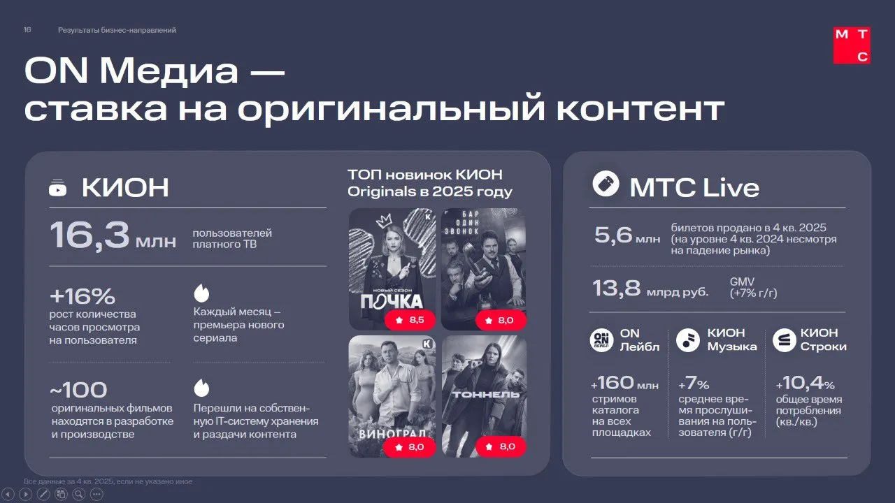 Холдинг ON Медиа, управляющий развлекательными бизнесами группы МТС онлайн и офлайн, объявляет финансовые и операционные результаты деятельности за IV квартал и весь 2025 год. Ключевыми драйверами роста в октябре-декабре стало увеличение доходов от ОТТ- и ТВ-сервисов и рост выручки от концертов. Аудитория онлайн-кинотеатра КИОН росла за счет регулярного выпуска оригинального контента, наибольший интерес со стороны новых пользователей по итогам года вызвал сериал «Бар "Один звонок"» с Данилой Козловским.
